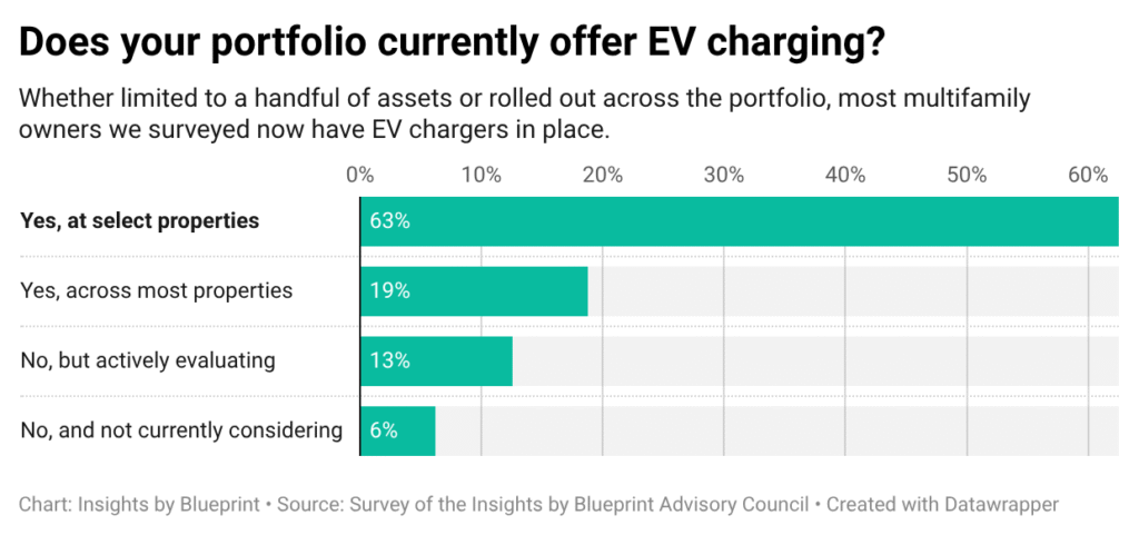 According to our survey, multifamily operators are beginning to catch up. In a survey of the Insights by Blueprint Advisory Council, 63 percent of operators said they currently offer EV charging at select properties, while another 19 percent have deployed it across most of their portfolios. Just 6 percent reported that they neither offer EV charging nor plan to.