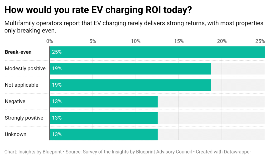 Our survey of multifamily operators on the Insights by Blueprint Advisory Council shows a market in transition. Operators are deploying chargers, recovering costs, and in some cases generating real returns. But uneven demand, vendor risk, and electrical constraints continue to limit confidence and capital commitment.