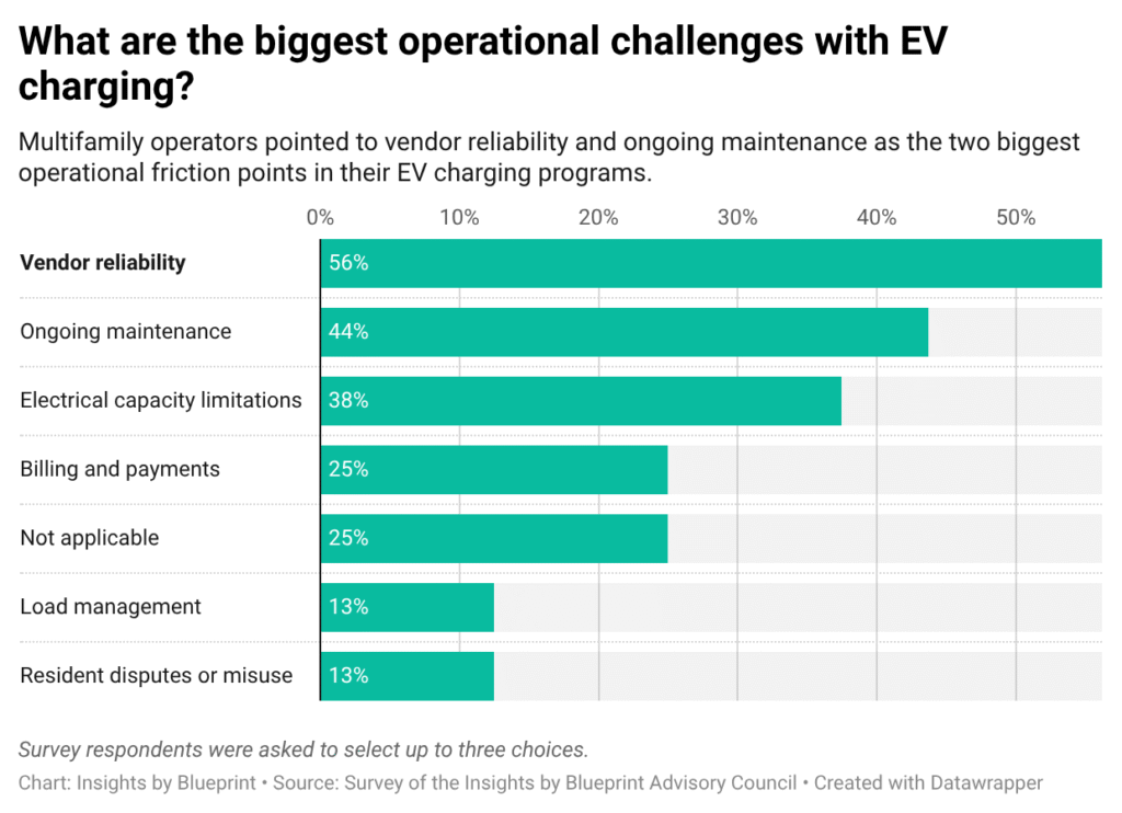 Most multifamily properties were never designed for dozens of high-load charging sessions running overnight. Without intelligent load management, even 10 to 20 Level-2 chargers can overwhelm a building’s electrical service, triggering costly upgrades or reliability issues. In our survey, 38 percent of operators cited electrical capacity as their single biggest challenge. But that technical bottleneck is only part of the story.
