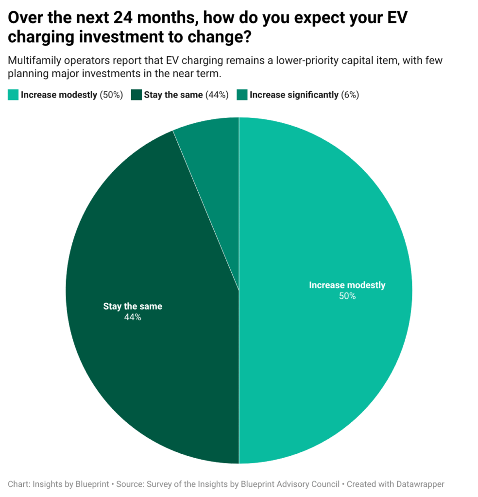 But despite warnings from EV charging providers about accelerating adoption and looming capacity gaps, most multifamily operators are not yet treating charging as a high-priority capital investment. In our Blueprint survey, 50 percent of respondents said their spending on EV charging over the next 24 months will increase only modestly, while 44 percent expect it to remain roughly flat. Just 6 percent anticipate a significant increase. This suggests that, for now, many owners see EV charging as something to manage incrementally rather than aggressively scale.