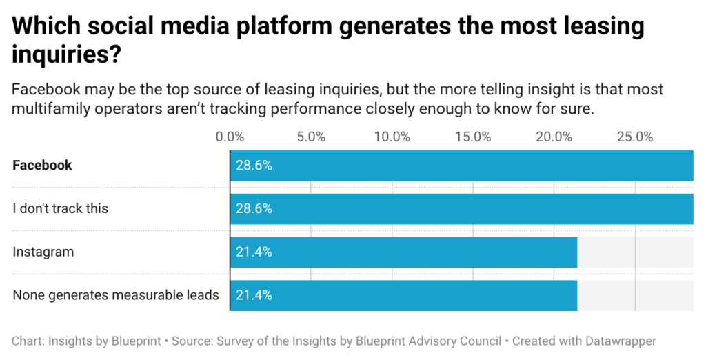 Facebook was the most commonly cited driver of leasing inquiries, with 28.6% of respondents naming it as their top-performing platform. But an equally large share (28.6%) said they don’t track which platforms generate leads at all. Instagram trails behind at 21.4%, while another 21.4% of respondents said none of their social media activity produces measurable leasing leads.