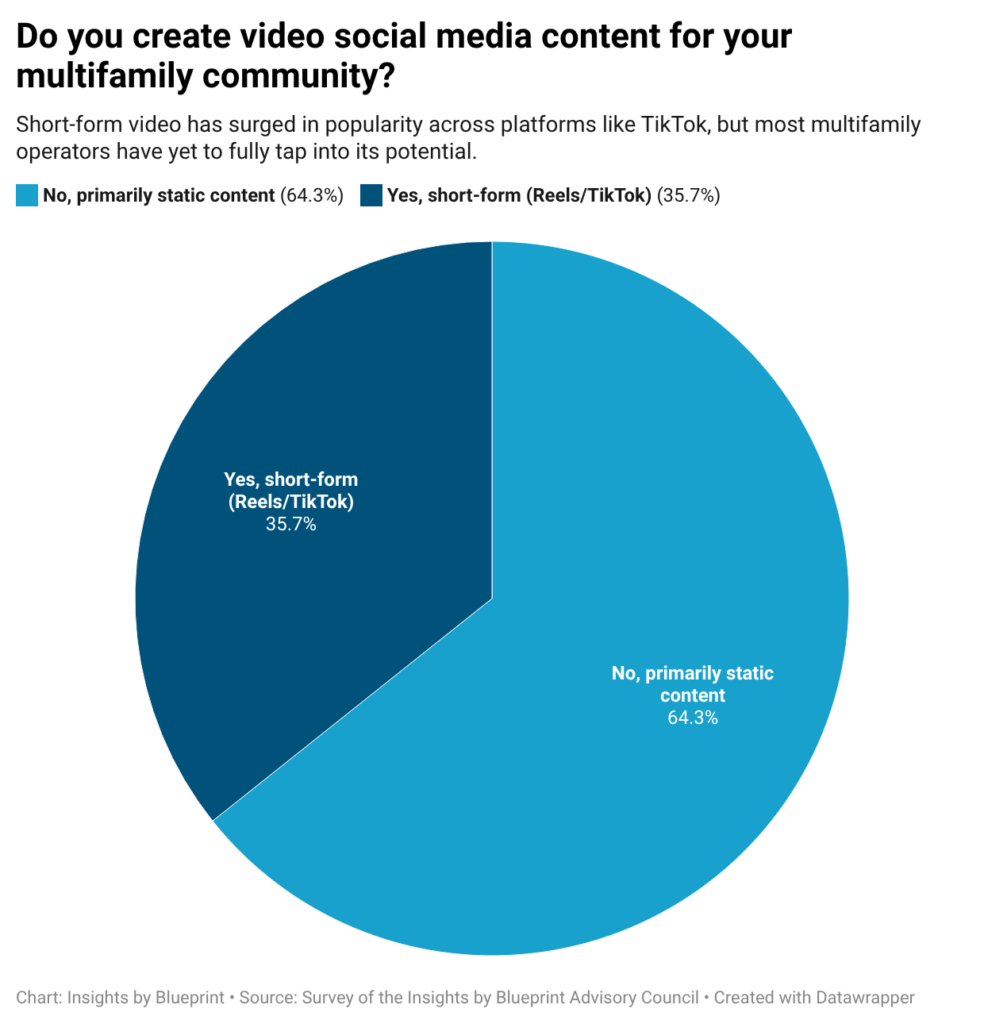 Our survey of the Insights by Blueprint Advisory Council suggests short-form video remains underutilized across the multifamily sector. Just 35.7% of operators said they regularly post video content on platforms like TikTok and Instagram Reels, while a clear majority (64.3%) still rely primarily on static posts.