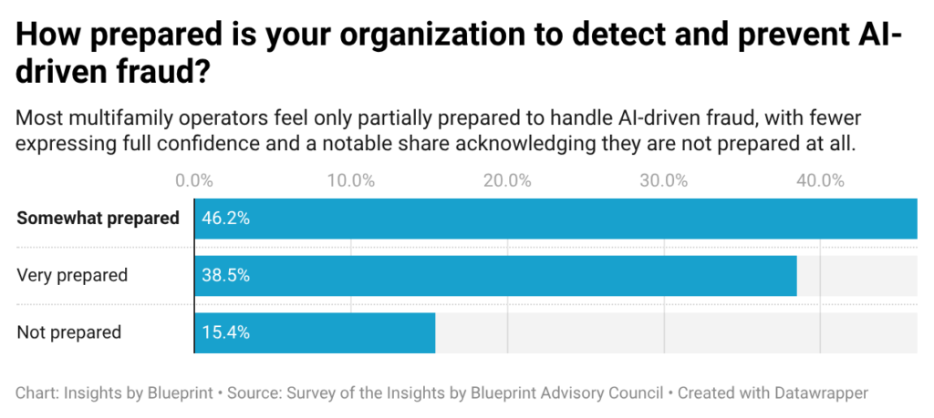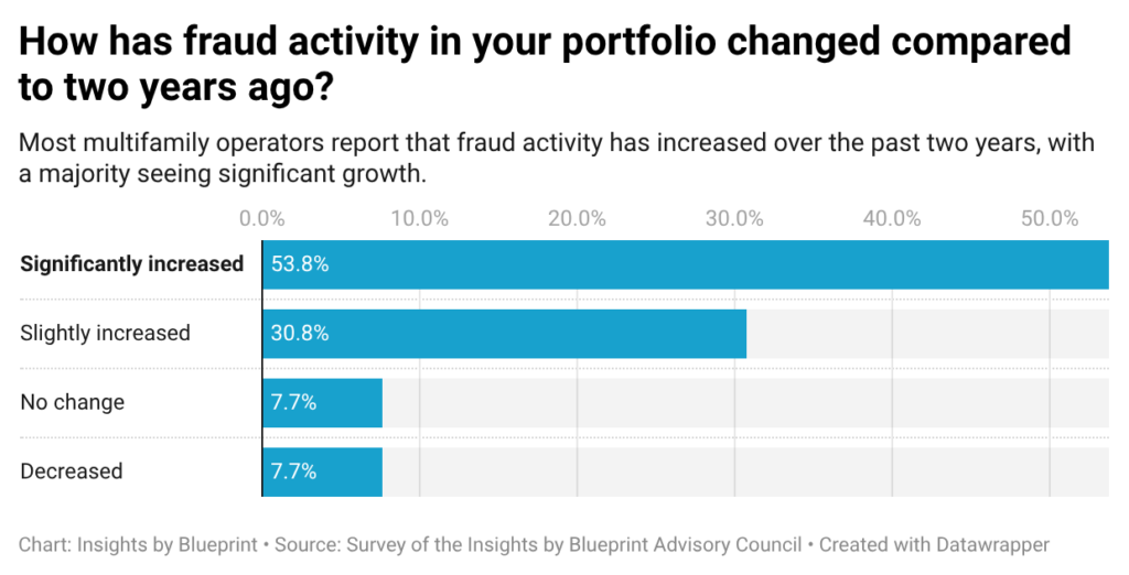 Our recent survey of the Insights by Blueprint Advisory Council reveals that multifamily application fraud is rising fast, becoming more sophisticated, and may be outpacing the industry’s ability to fully contain it. What was once an occasional issue is now relentless. Roughly 85% of respondents reported an increase in fraud activity, with more than half calling that increase significant. A minority of respondents saw no change or a decline, reinforcing that this is not a temporary spike but a sustained trend.
