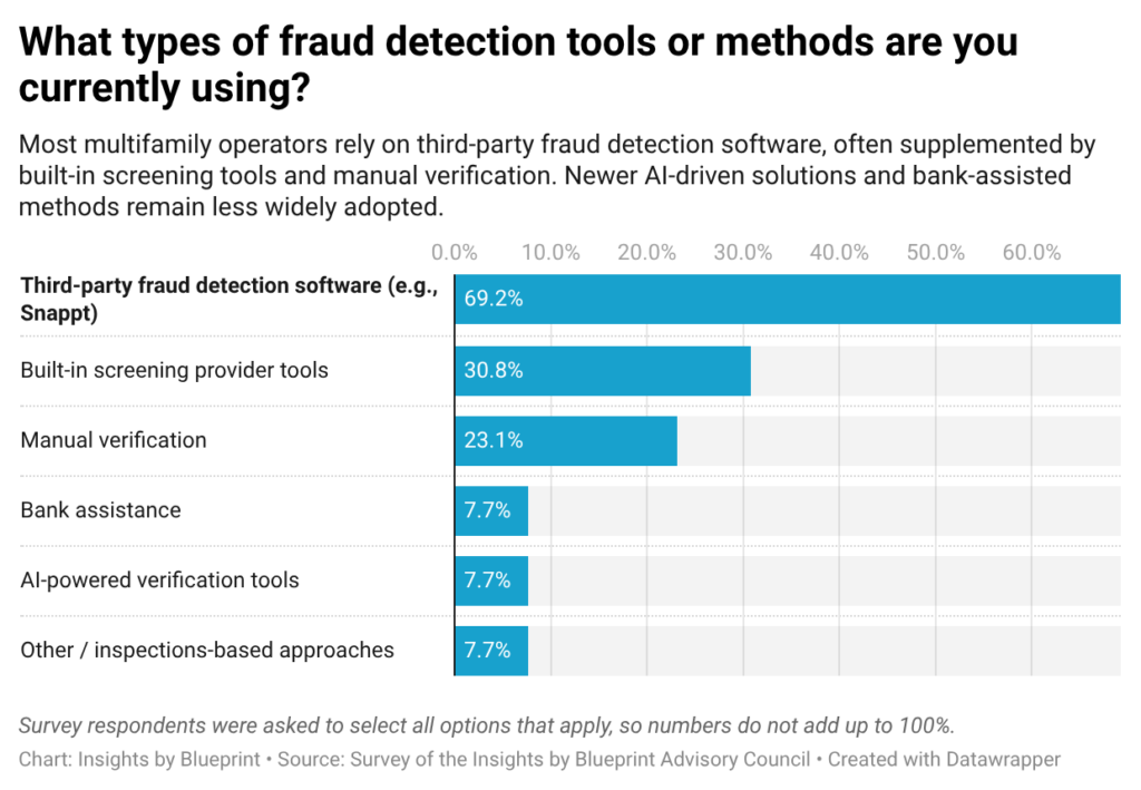 In response, the industry has largely standardized around third-party verification tools. About 69% of respondents rely on platforms such as Snappt, while smaller shares rely on built-in screening systems or manual processes. While existing tools are widely regarded as effective — 100% of respondents rated them at least moderately so — they may not be keeping pace with the evolving threat landscape.